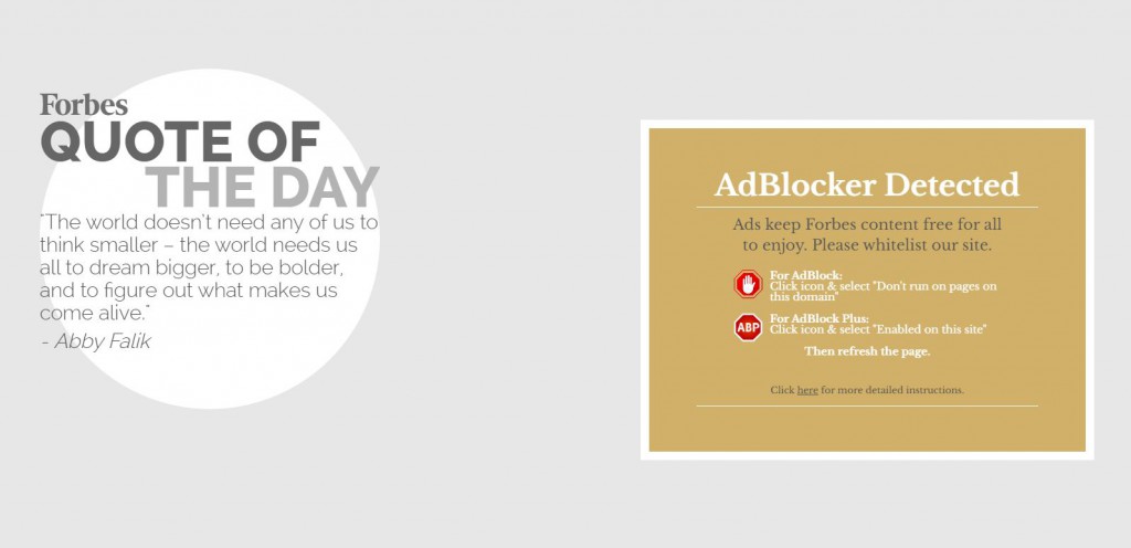 The hardest line in the ad blocking front has been taken by a few of the largest and most influential media sites on the web. Wired, Forbes and GQ are completely blocking access to their content unless the user turns off their ad blocker or signs up for a paid subscription. WIRED recently explained their rationale in a post to their readers: